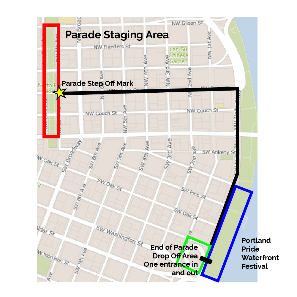 The parade staging area is located in the North Park Blocks area, bounded by Broadway, Burnside, NW 10th and Glisan St. You will be assigned a specific block, depending on your contingent number. There are two check-in areas.